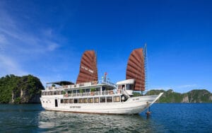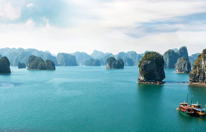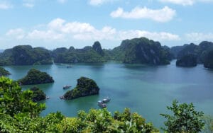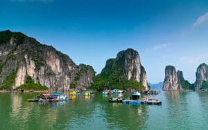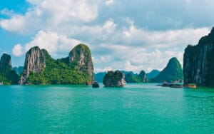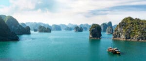 La mythique et captivante Baie D’HALONG, ses paysages majestueux et féeriques. Un sublime cadeau de la nature, une eau couleur jade ou chacun rêve de se baigner, où l’on trouve des milliers de roches calcaires pittoresques.